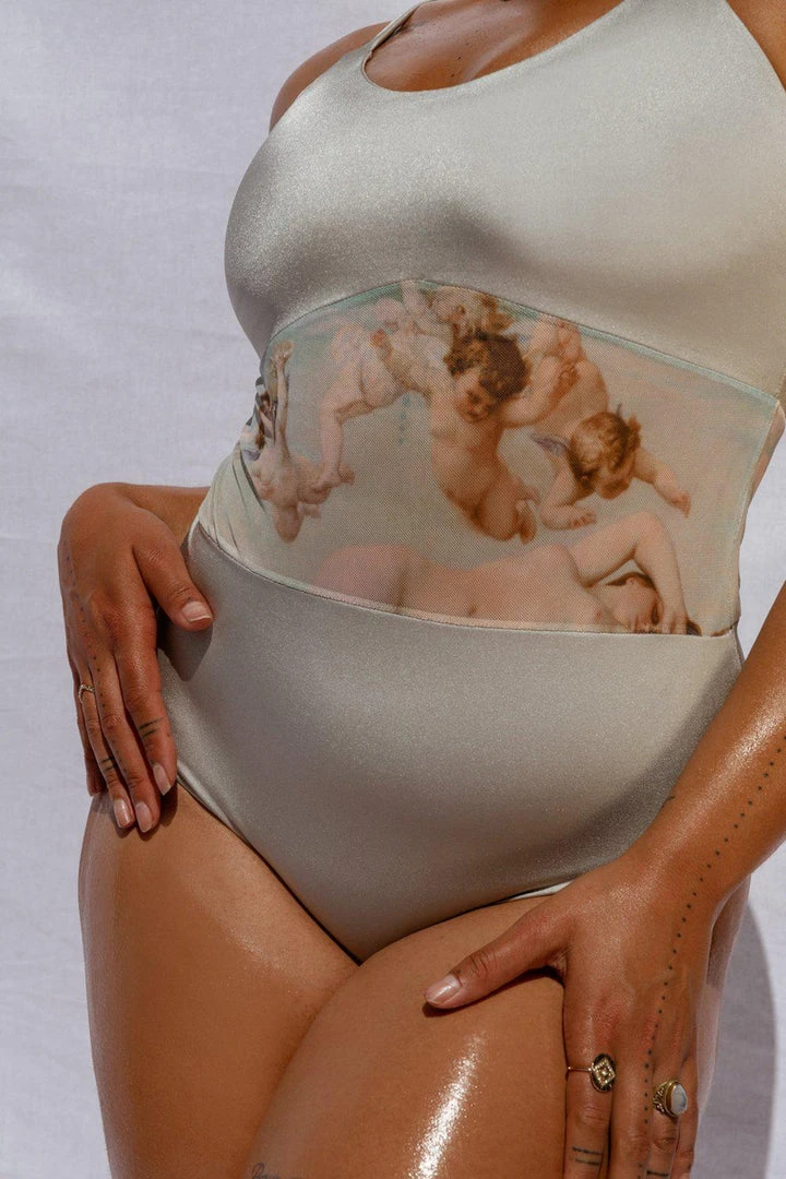 Constructed for movement, the garments aesthetic is soft and fabrics silky, however the garment still provides good support and coverage. This statement piece is only available in Platinum.