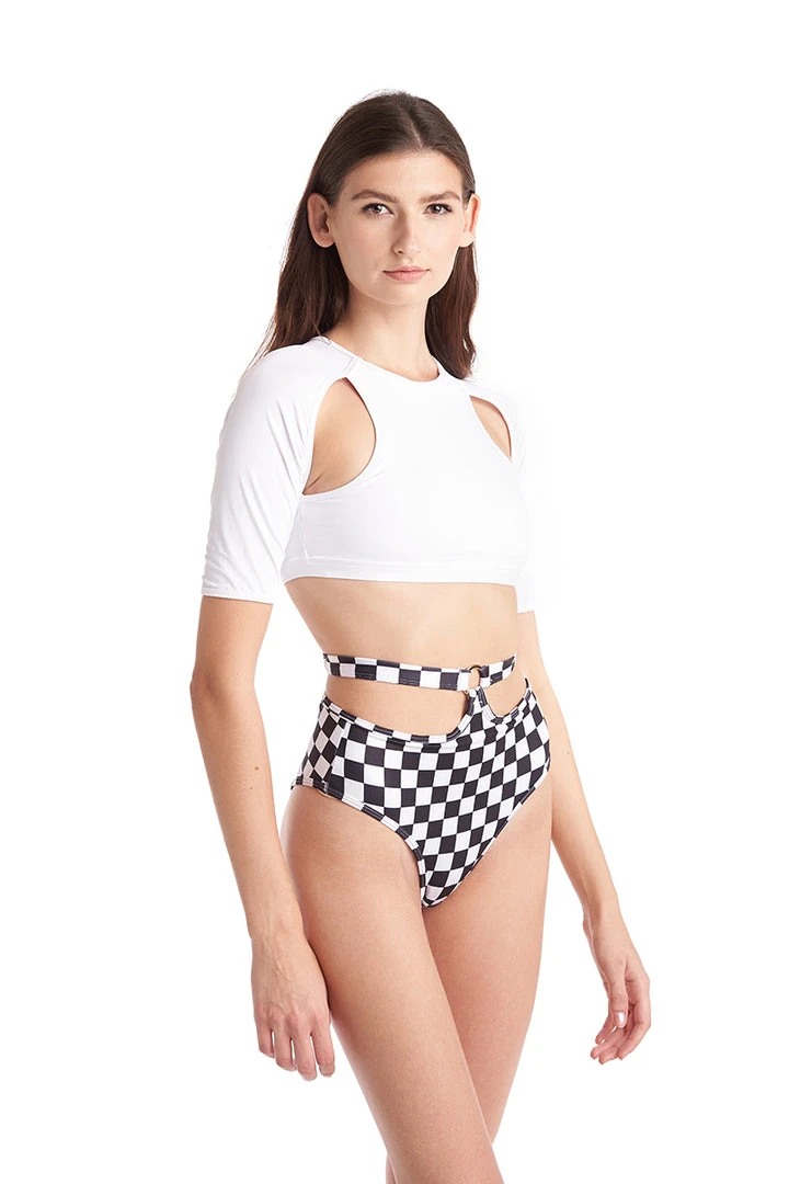 A long sleeved crop top with a pole friendly cut out design. This top offers full coverage without stopping you nailing though armpit grip tricks.