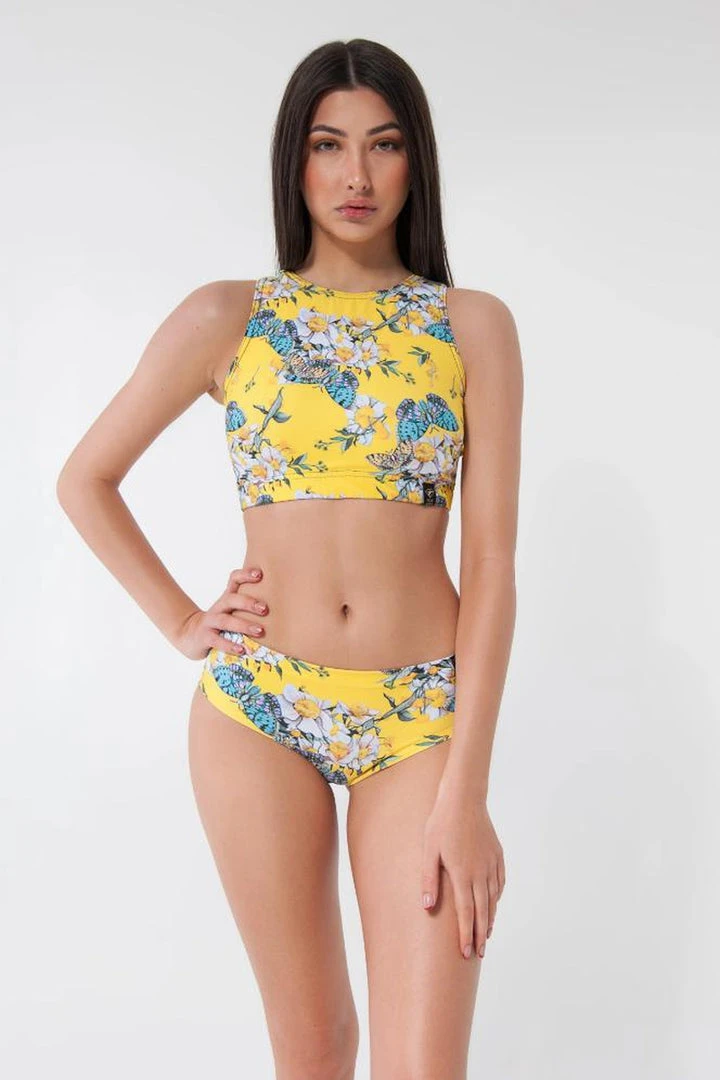Looking for a full coverage, supportive top in a print you love? The Cross Back top is for you. Fully printed front with Black cross strap back. Matched here with the Floria Hot Pants.
