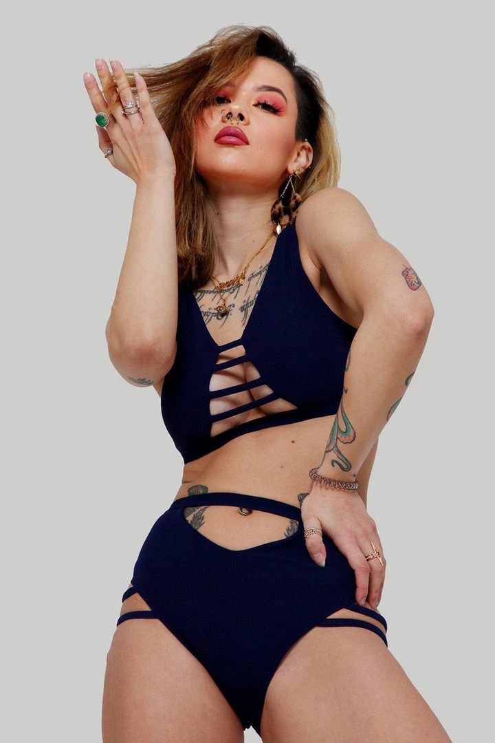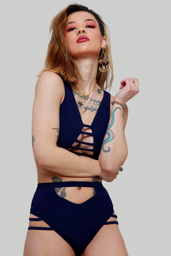For the studio socialites, this high waist means business with peekaboo cut outs front and back and high-legged straps.