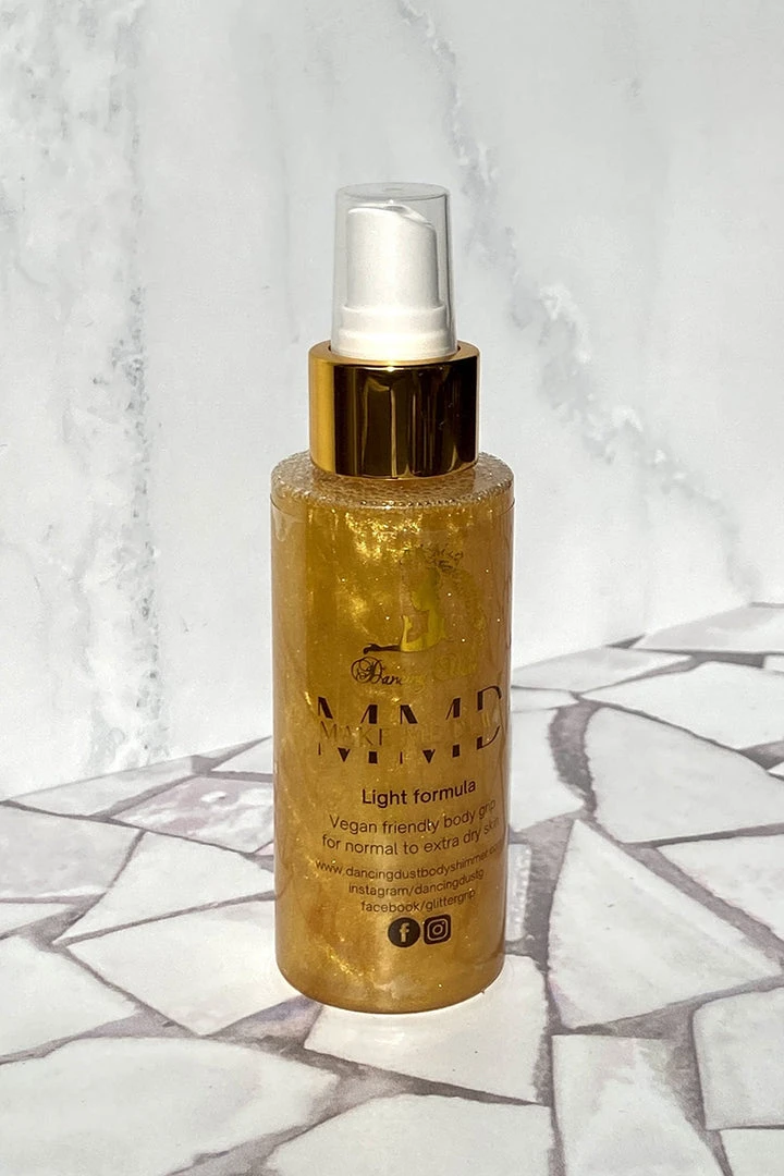 Application: Shake well before use. The glitter will settle and needs a little waking up. Spray onto the skin and apply a thin layer. More layers can be added for more intensity. Let dry for 30-60 seconds. Not advised for hand use.