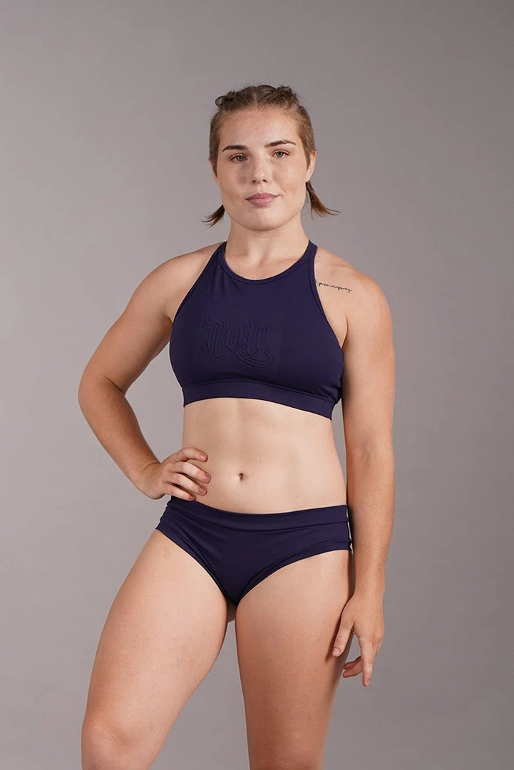 High neck sports bra featuring Sarah Scott’s Ambigram Logo, read upside down as well as right way up in a subtle embossed print. This new design is supportive with a criss cross back to suit all body types.