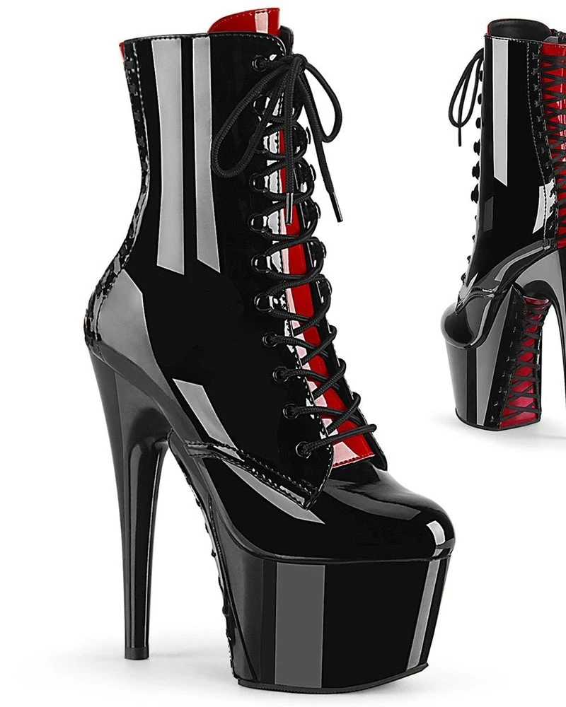 - Platform Two Tone Lace-up Front Ankle Boot with Interchangeable Color Tongues (Red & Black) and Corset Style Lacing on Platform Underside & at the Back, Inside Zip Closure