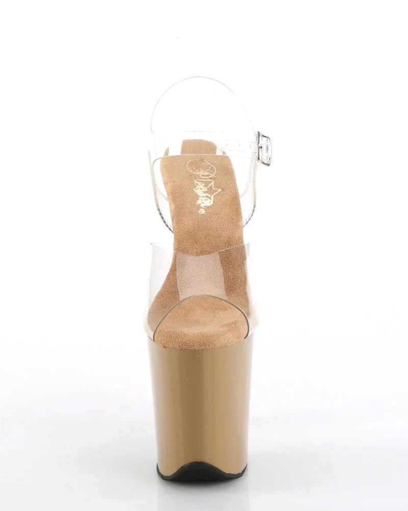 Fashion forward neutral tone Pleasers with barely there clear straps.