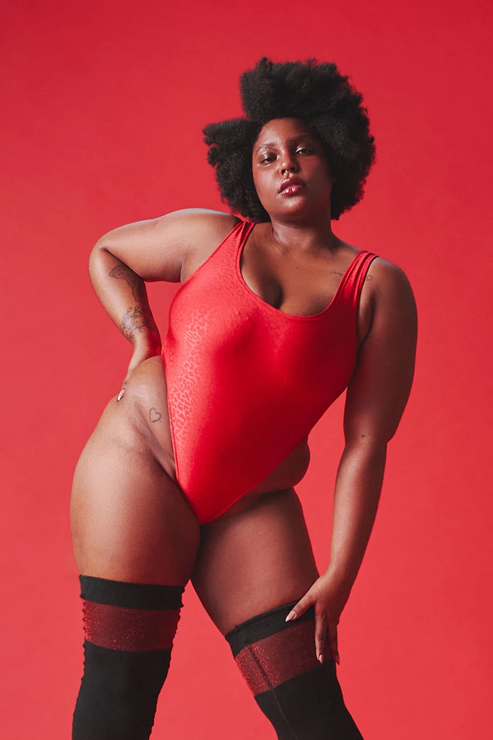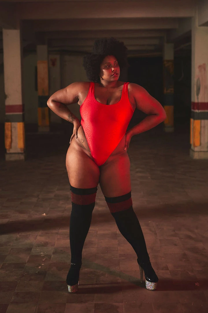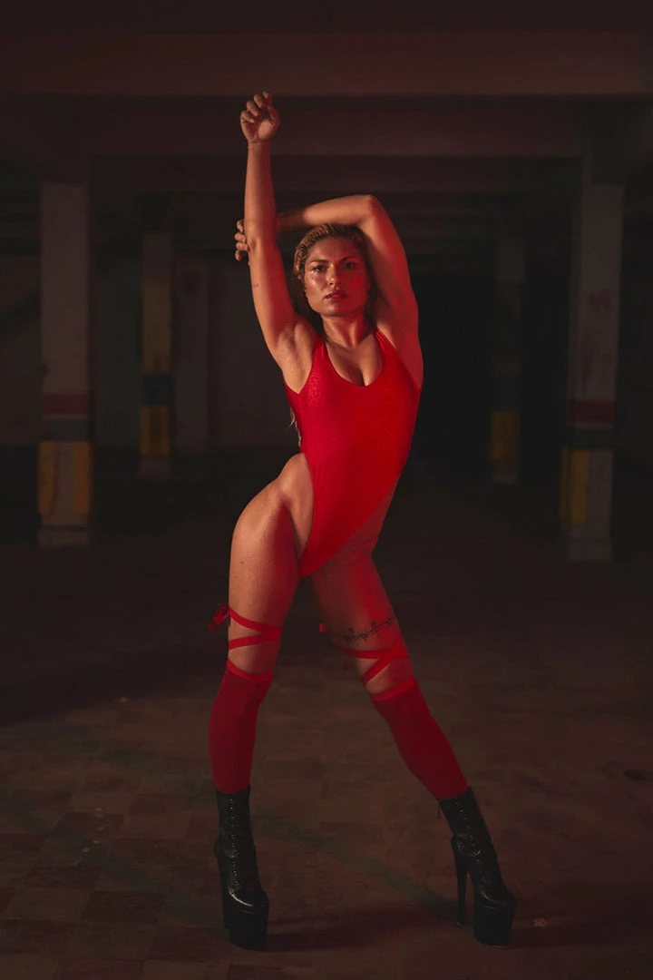 A high leg thong bodysuit that can be worn in and out of the studio. Styled here over he knee socks.