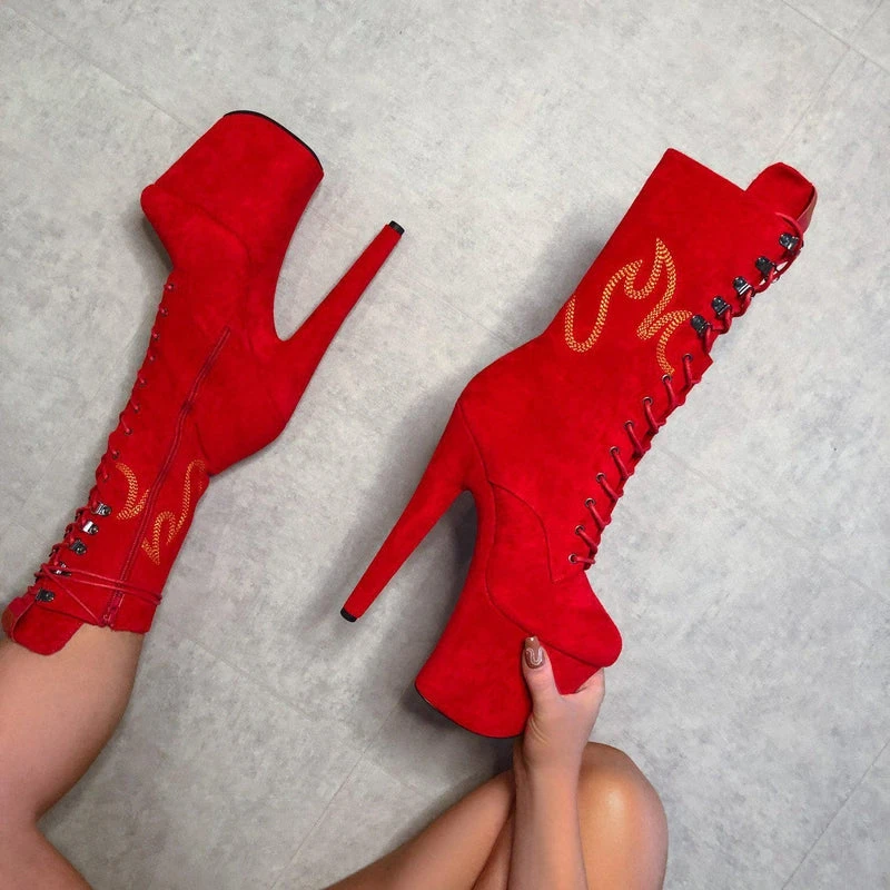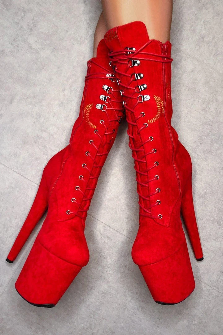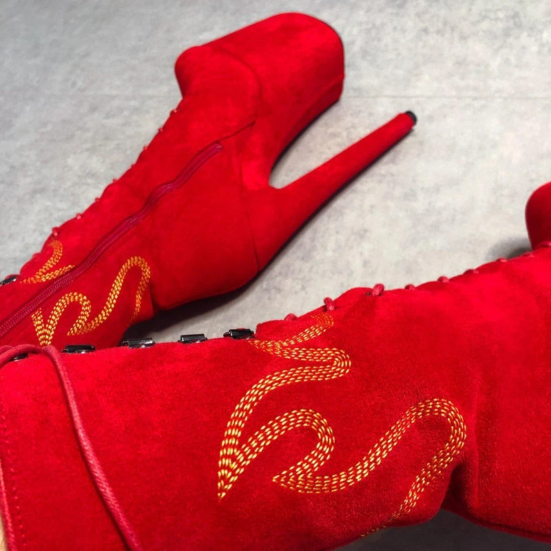 Feel like a flamin’ hot cheeto in these Hot Red faux suede Boots with yellow flame detailing.