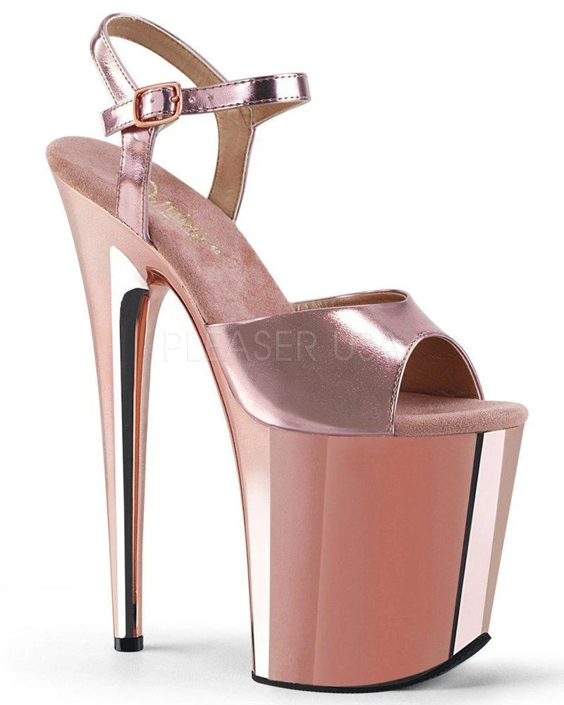 - Metallic Rose gold uppers and rose gold chrome platform